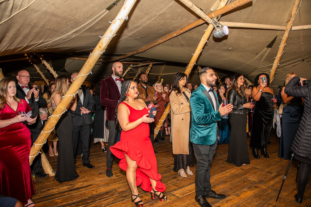 After a short stroll through the gardens—beautifully illuminated by festoon lighting from Scorpion Production Group—guests arrived at Wonderland Venues’ permanent tipi, greeted by the glorious tones of our singer, Becky, and cocktails provided by Shake the Spirit.