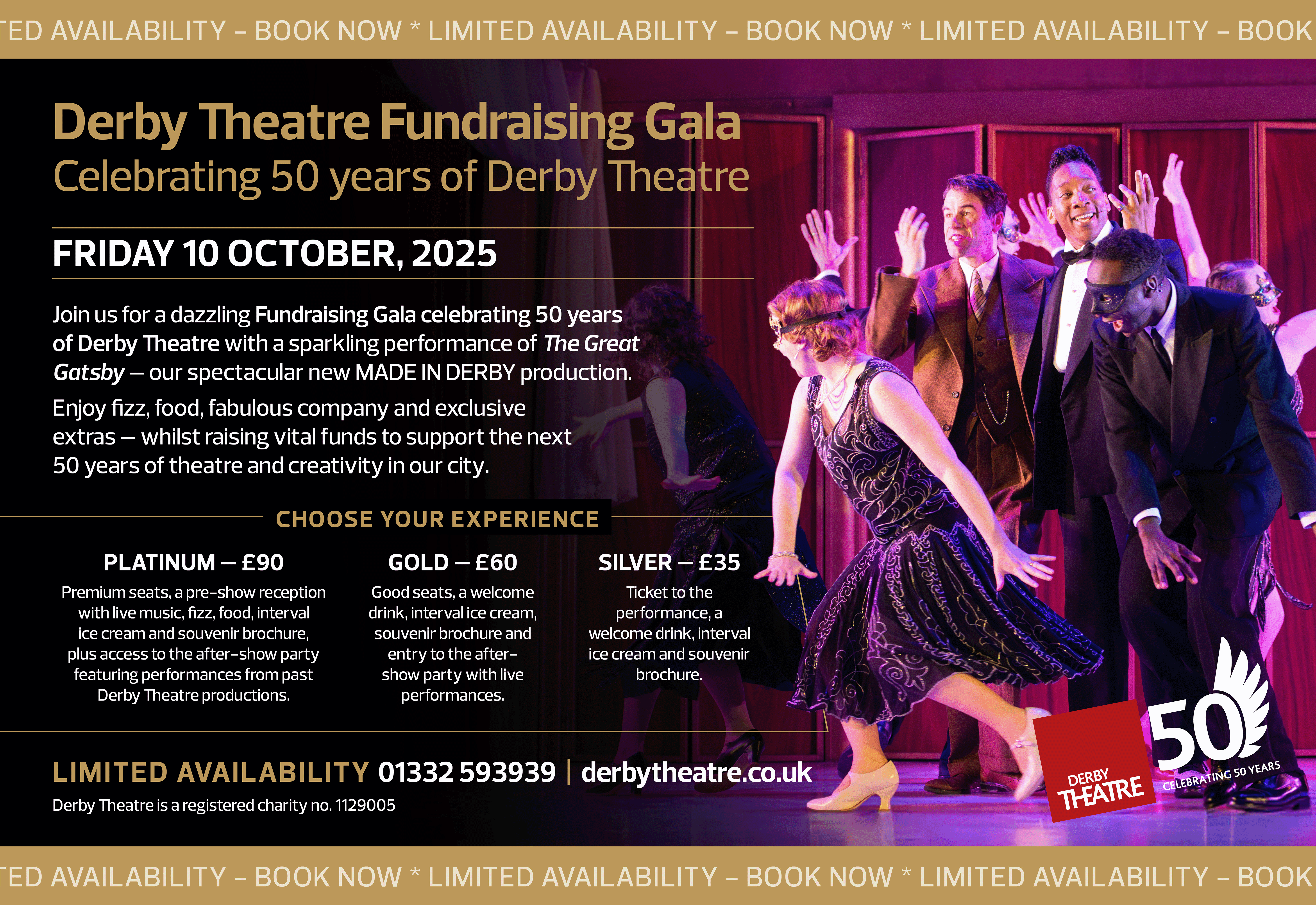 Derby Theatre’s Fundraising Gala, including a spectacular performance of The Great Gatsby, promises a true red-carpet celebration of 50 remarkable years of theatre-making – and a bold step into the future. Book your tickets now to play your part in shaping the next 50 years of creativity and culture at Derby Theatre.