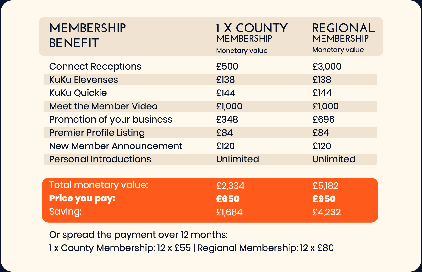 KuKu Connect members enjoy a 20% discount on East Midlands Chamber of Commerce membership and at least 10% off FSB membership – and if you’re already a Chamber member you’ll get 20% off KuKu Connect, or 10% off if you’re an FSB member.